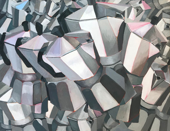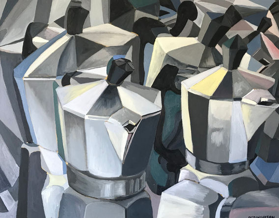 My series of cubist paintings sprang from the obsessive repetition of shapes within and around my caffetiere still life objects. Cubist paintings of other still life objects have evolved since.